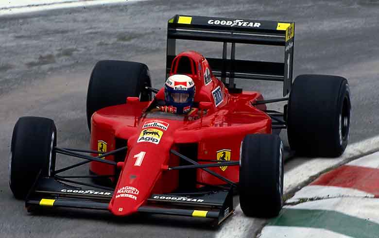 Самые важные модификации F1-89 отразились в носовом обтекателе, вертикальных увеличенных воздухозаборниках по бокам, отсеке двигателя измененной формы и немного приподнятом топливном баке. Сверху Ferrari F1-90 напоминала бутылку Coca-Cola. Значительно уже стала задняя часть корпуса, что затруднило вывод выхлопных труб. Они были расположены рядом с блоком 12-цилиндрового двигателя объемом 3.5 л. без наддува и продольно установленной трансмиссией. Однако секрет успеха F1-90 - в его простоте. Исчезли проблемы с надежностью, которые возникали из-за сложности гидроконтроля F1-89, и это позволило Скудерии зарабатывать важные очки почти на каждом Гран-При.