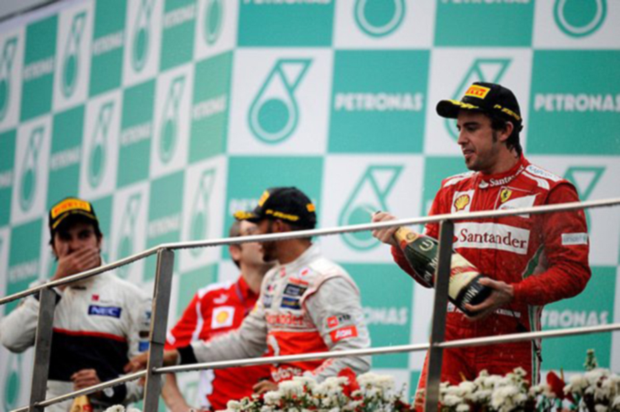 Название: Гран При Малайзии 2012 г воскресенье 25 марта Серхио Перес Sauber F1 Team, Фернандо Алонсо Scuderia Ferrari победитель гонки и Льюис Хэмилтон Vodafone McLaren Mercedes