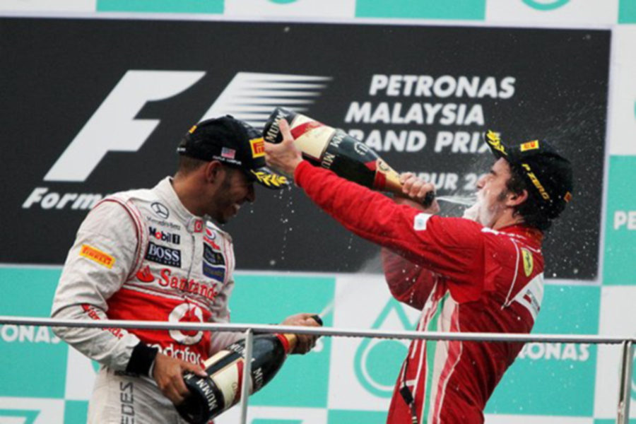 Название: Гран При Малайзии 2012 г воскресенье 25 марта Фернандо Алонсо Scuderia Ferrari победитель гонки и Льюис Хэмилтон Vodafone McLaren Mercedes