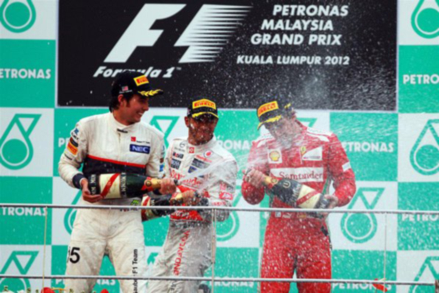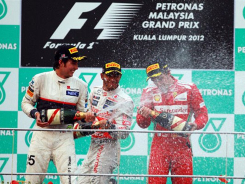 Название: Гран При Малайзии 2012 г воскресенье 25 марта Серхио Перес Sauber F1 Team, Фернандо Алонсо Scuderia Ferrari победитель гонки и Льюис Хэмилтон Vodafone McLaren Mercedes