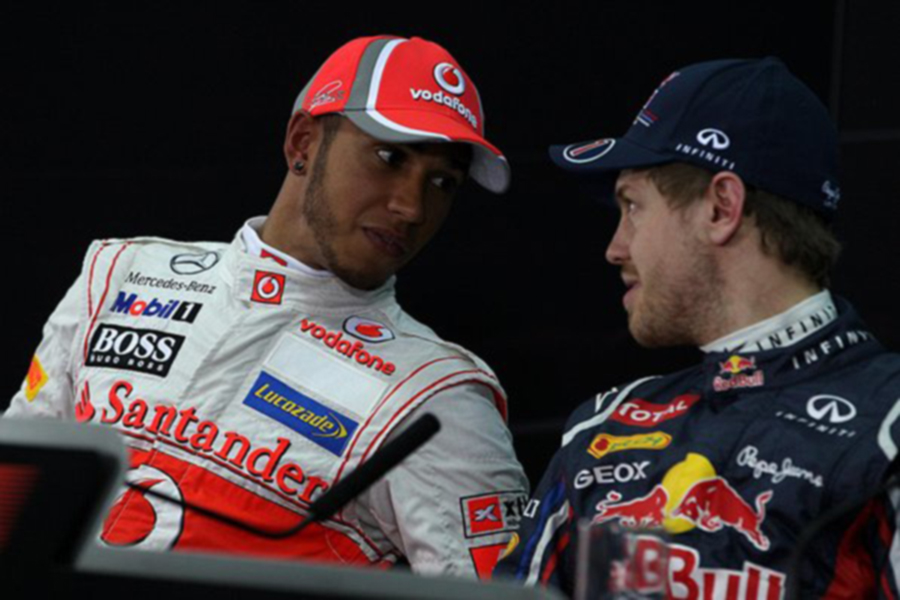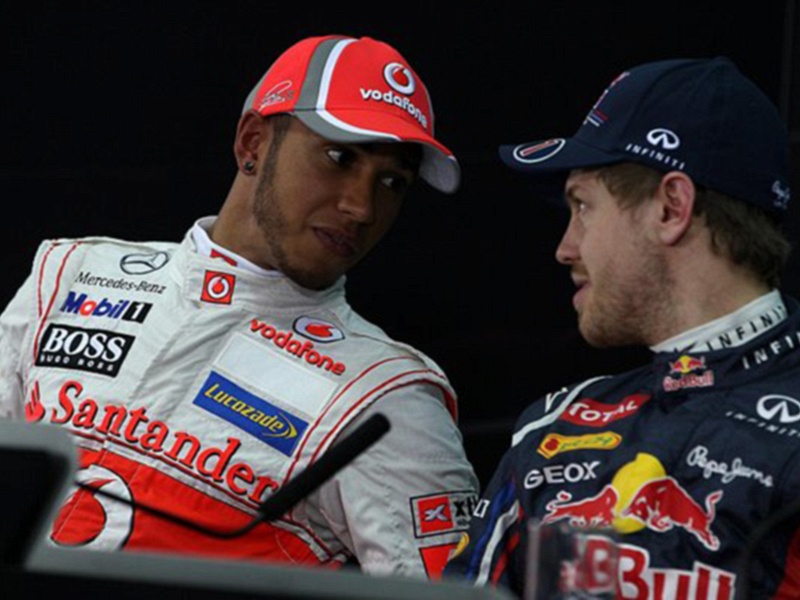 Название: Гран При Бахрейна 2012 г суббота 20 апреля квалификация Льюис Хэмилтон Vodafone McLaren Mercedes и Себастьян Феттель Red Bull Racing