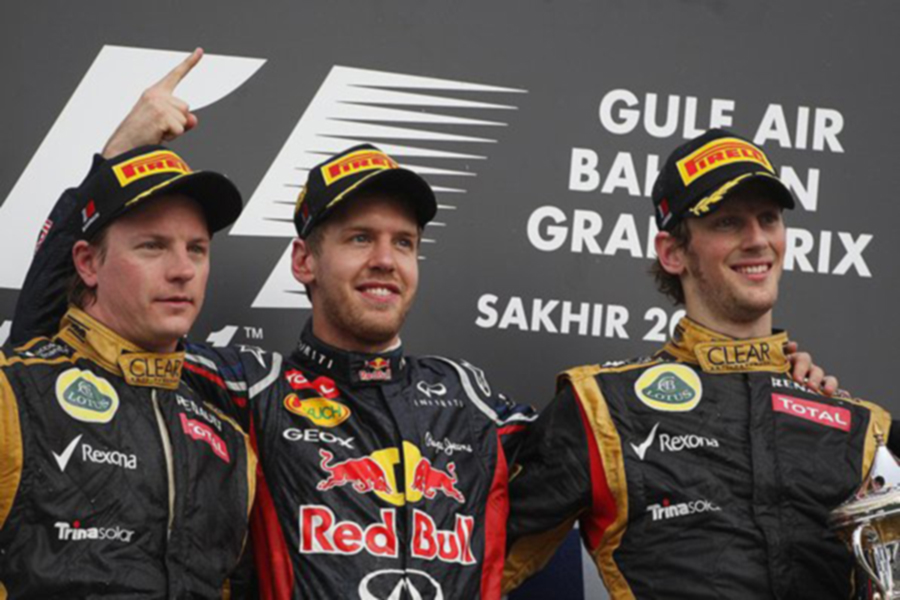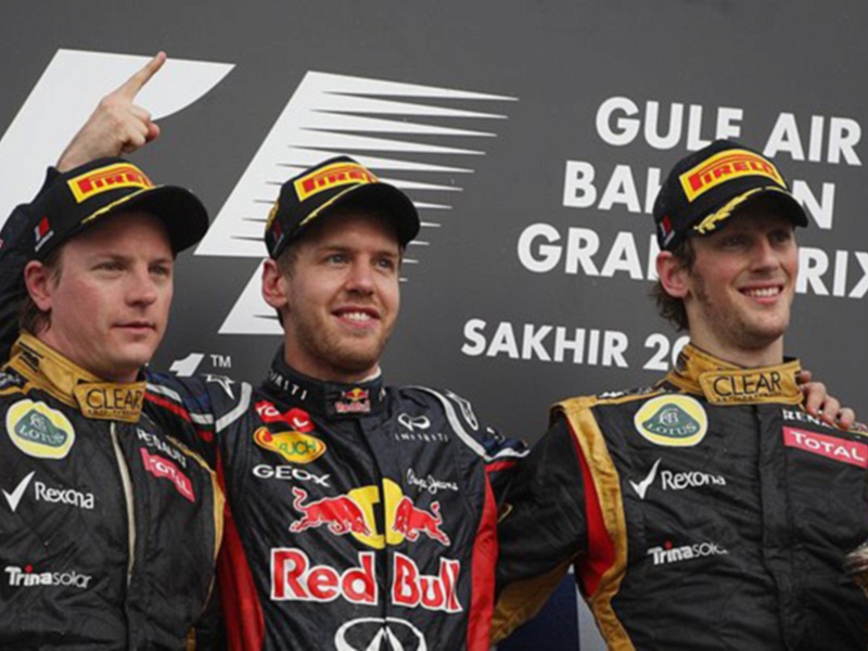 Название: Гран При Бахрейна 2012 г воскресенье 22 апреля победитель гонки Себастьян Феттель Red Bull Racing, Кими Райкконен и Ромэн Грожан Lotus F1 Team