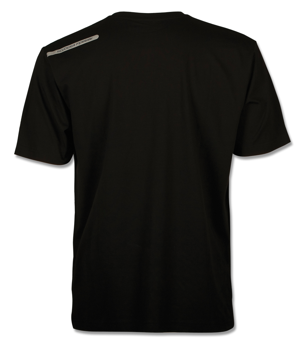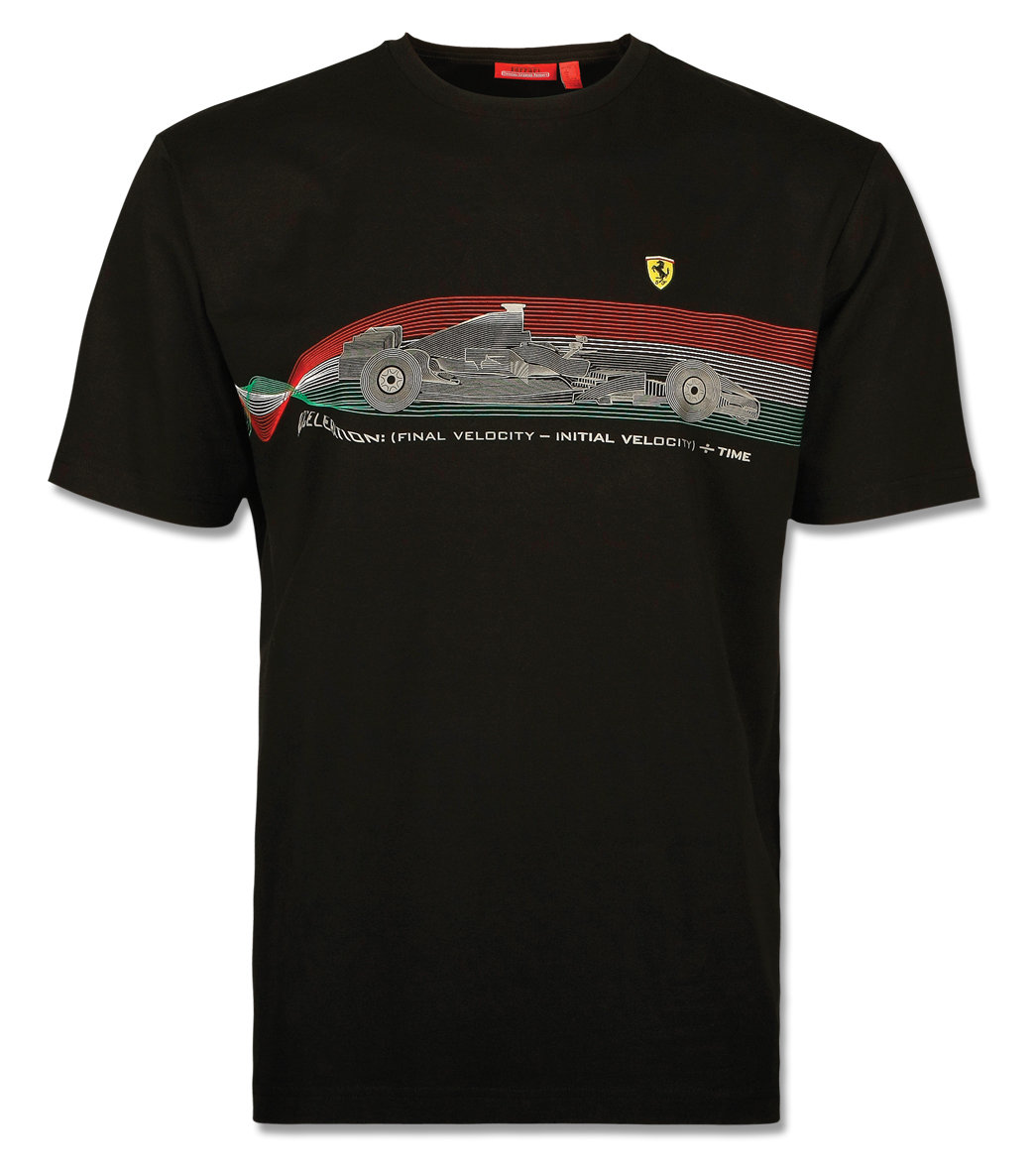 Футболка с изображением болида и эффекта обдува в аэродинамичкеской трубе и небольшим логотипом Ferrari. Сзади на плече надпись Scuderia Ferrari.