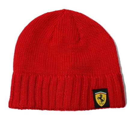 Вязаная шапка красного цвета. Лого Ferrari выполнен нашивкой. Логотип Puma (в цвет изделия) вышит на шапке.